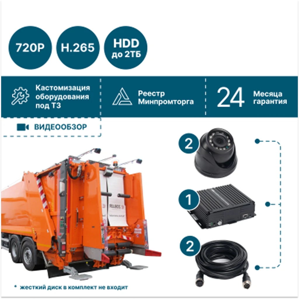 2-камерный комплект NSCAR MT201_HDD для мусоровозов с записью Full HD на HDD. Контроль погрузки и слепых зон.