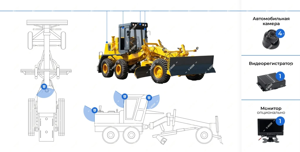 Комплект NSCAR ST401_SDBV360 – 4 камеры и монитор для кругового обзора грейдера. Защита от слепых зон и экстремальных условий.